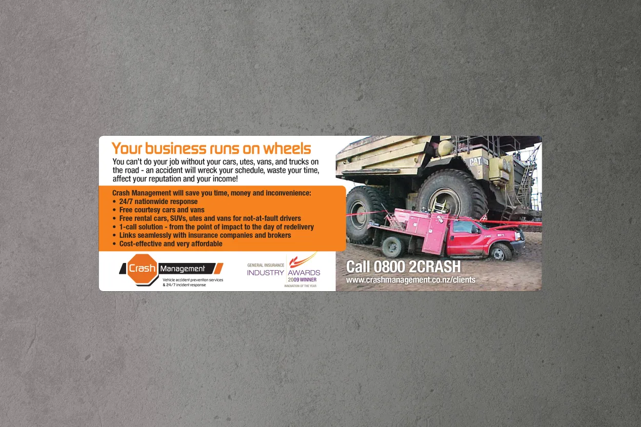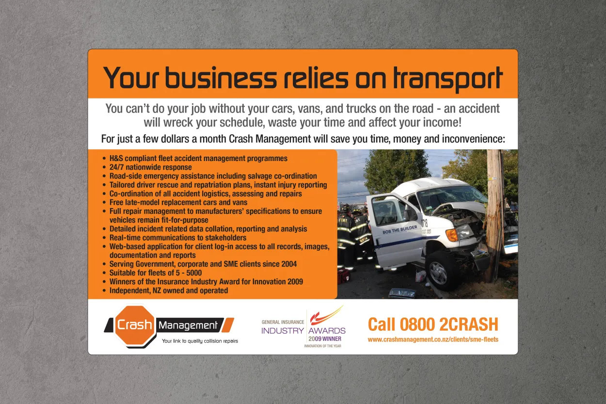 A variety of items have been produced for Crash Management over the years - from Business Cards, Flyers, Brochures, Expo stand material, to Magazine adverts and Online banner adverts, and redesigning their Website a couple of times as online developments continue to evolve - all to promote this business on many marketing fronts.